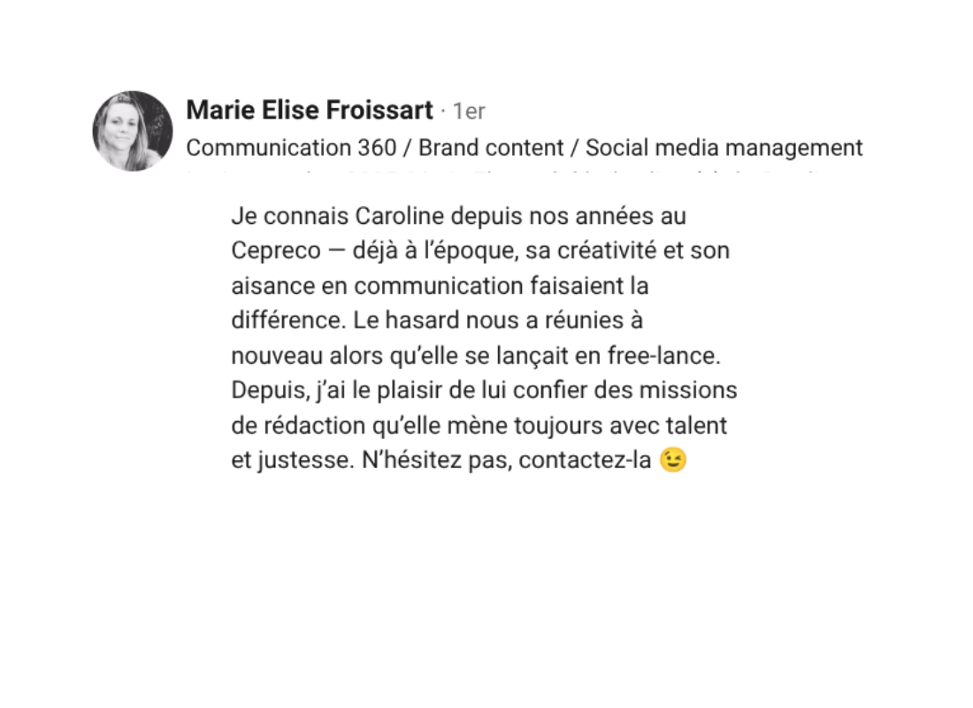 Je suis une amoureuse des mots et une communicante dans l’âme. Après 20 ans d’expérience acquise au sein de services communication & marketing de petites et grandes entreprises, j’ai décidé de me consacrer pleinement à la communication écrite et aux messages des marques.