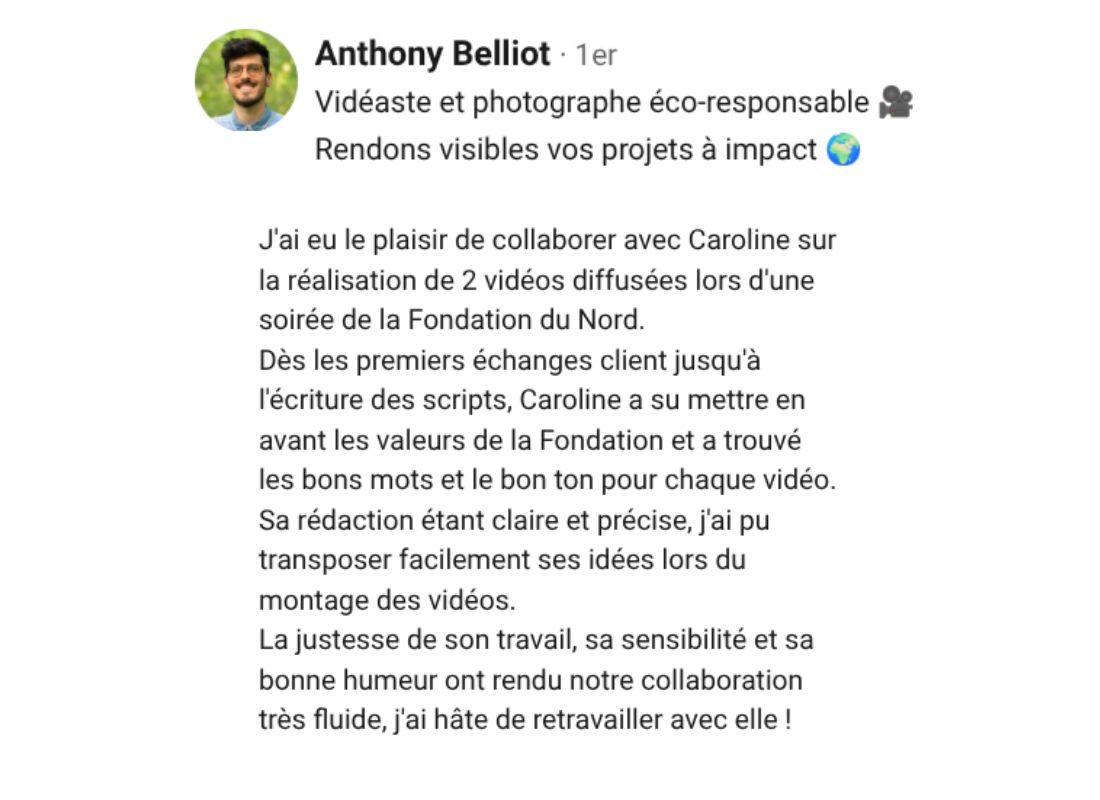 J'ai accompagné la Fondation du Nord dans la conception et la rédaction de deux scripts vidéos mettant en lumière l'engagement de l'équipe de la Fondation. Ces vidéos ont été diffusées lors de la soirée de gala de la Fondation.